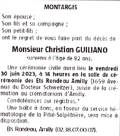 Cet espace « condoléances » est dédié à la mémoire de Monsieur Christian GUILIANO.