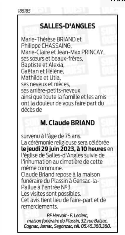 Cet espace « condoléances » est dédié à la mémoire de Monsieur Claude BRIAND.