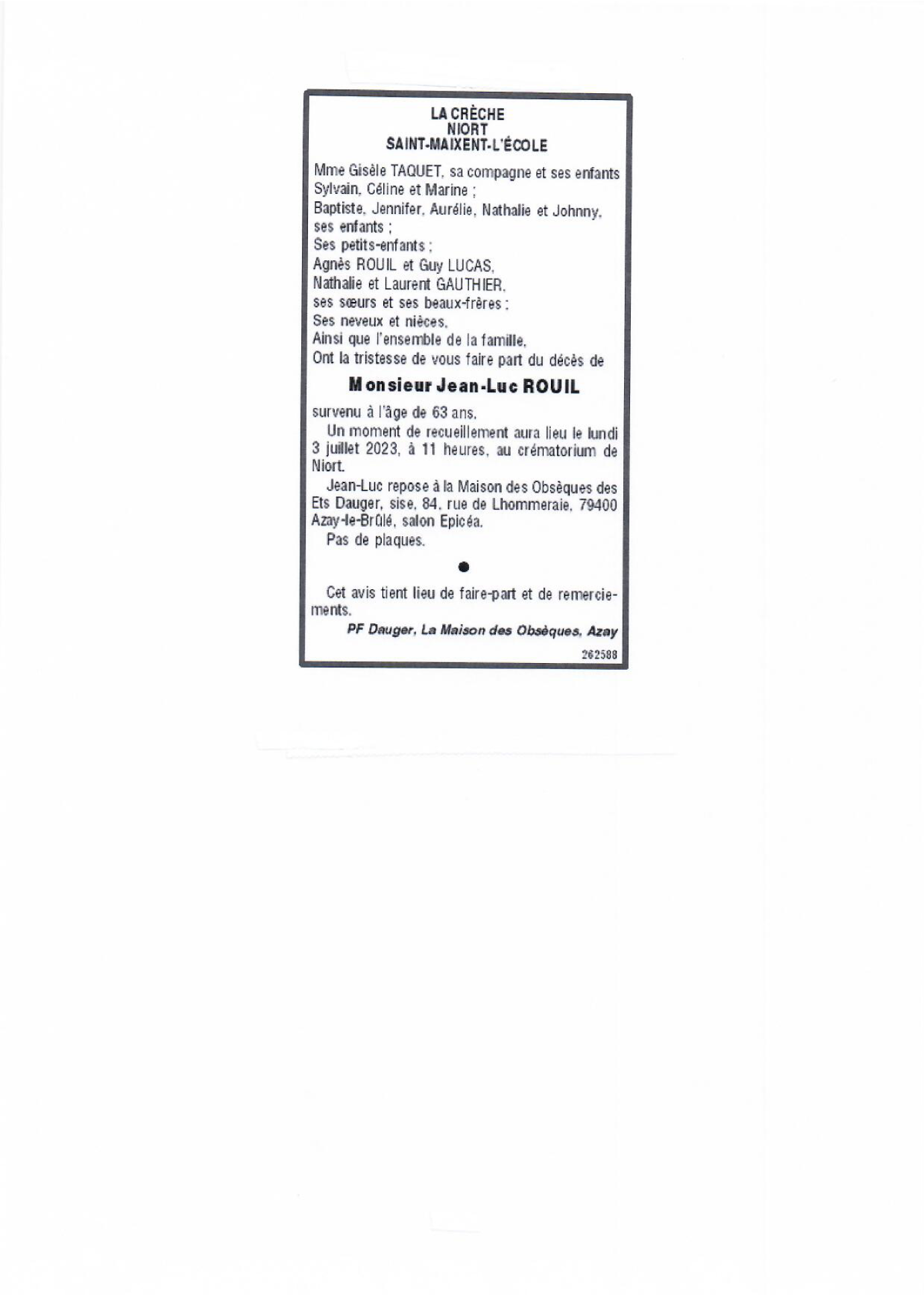 Cet espace « condoléances » est dédié à la mémoire de Monsieur Jean-Luc ROUIL.