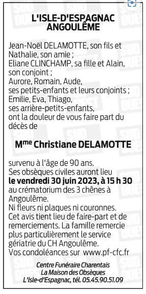 Cet espace « condoléances » est dédié à la mémoire de Madame Christiane DELAMOTTE.