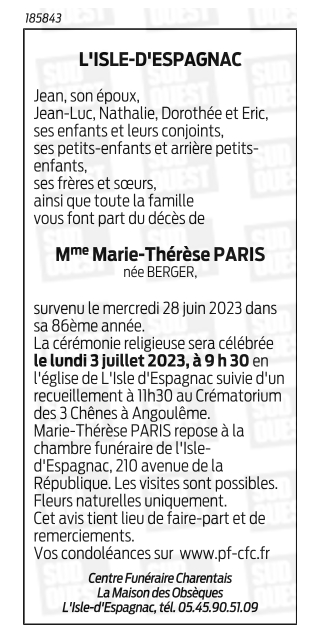 Décédée à L'Isle-d'Espagnac (16340) le mercredi 28 juin 2023