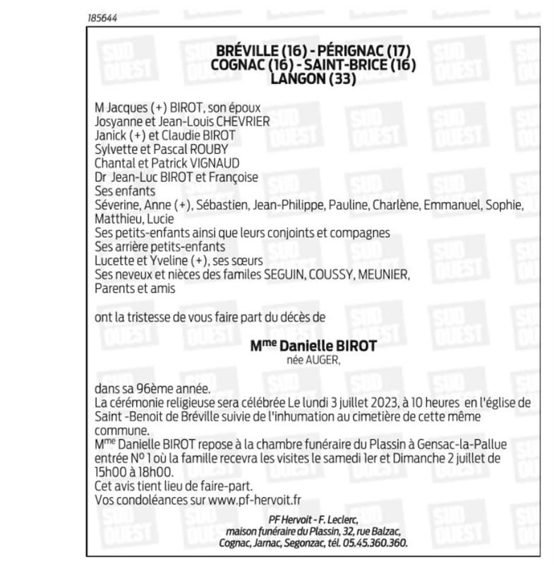 de Madame Danielle BIROT née AUGER