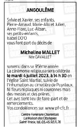 Décédée à Angoulême (16000) le jeudi 29 juin 2023