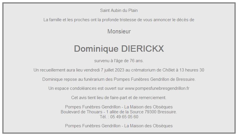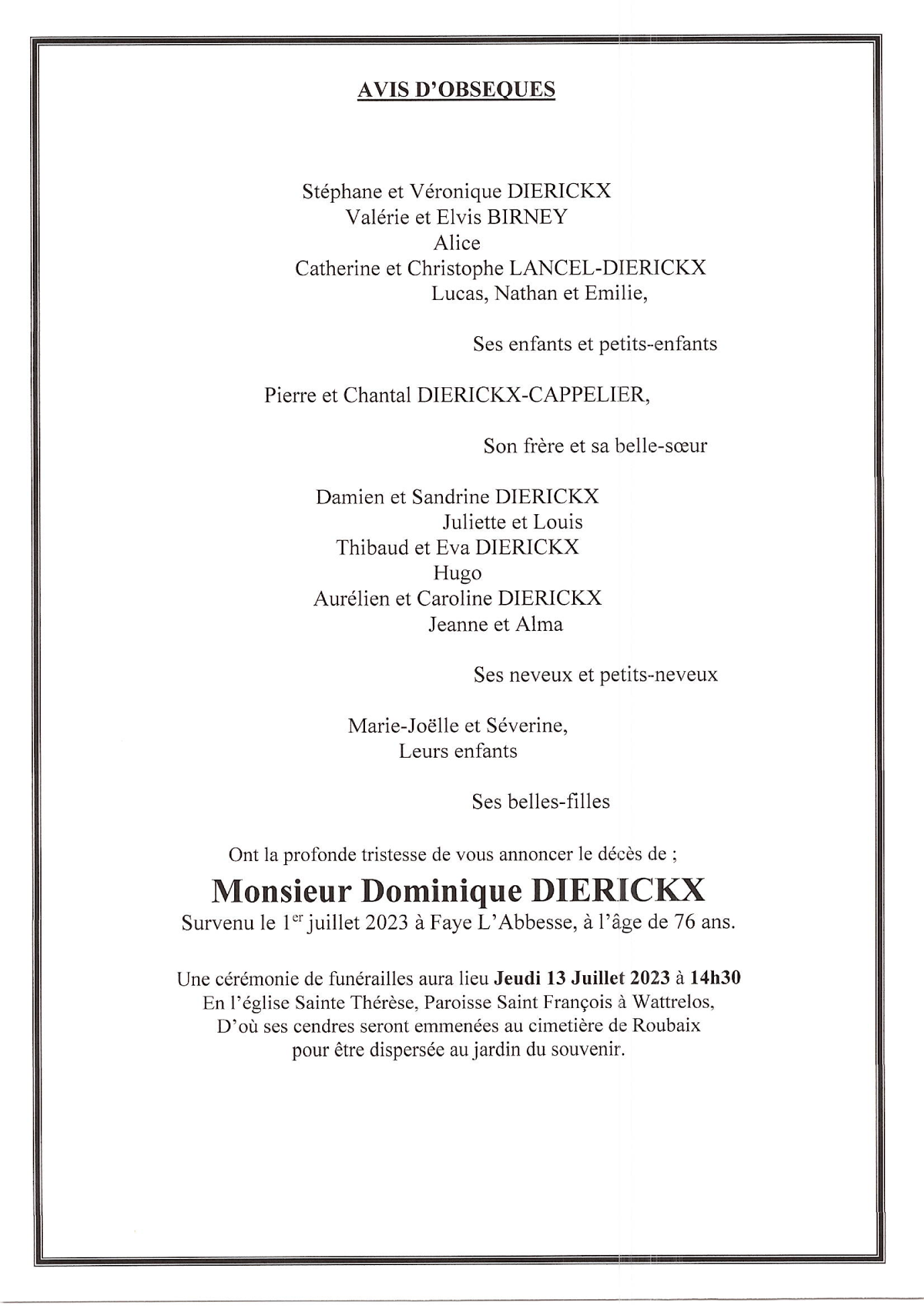 Cet espace « condoléances » est dédié à la mémoire de Monsieur Dominique DIERICKX.