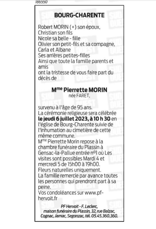de Madame Pierrette MORIN née FARET
