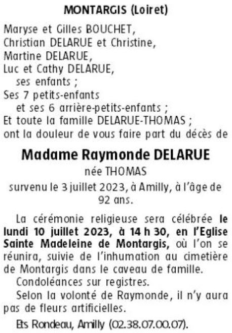 Cet espace « condoléances » est dédié à la mémoire de Madame Raymonde DELARUE née THOMAS.