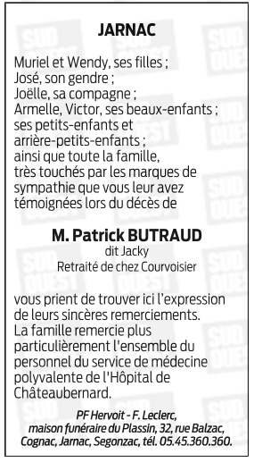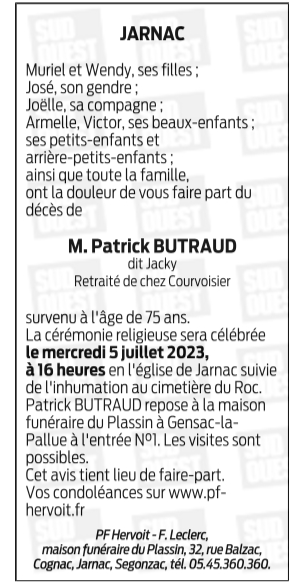 Cet espace « condoléances » est dédié à la mémoire de Monsieur Patrick BUTRAUD.