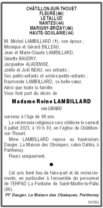 de Madame Reine LAMBILLARD née GIRARD