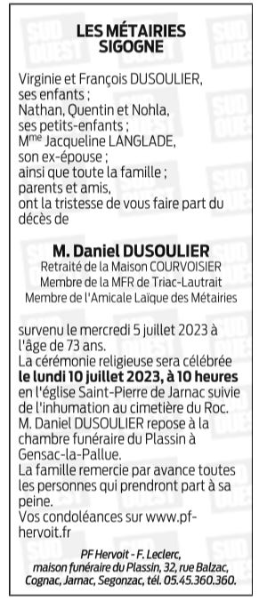 Cet espace « condoléances » est dédié à la mémoire de Monsieur Daniel DUSOULIER.
