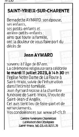 Décédé à Rivières (16110) le jeudi 6 juillet 2023