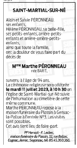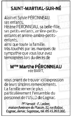Cet espace « condoléances » est dédié à la mémoire de Madame Marthe PERONNEAU née BARIT.