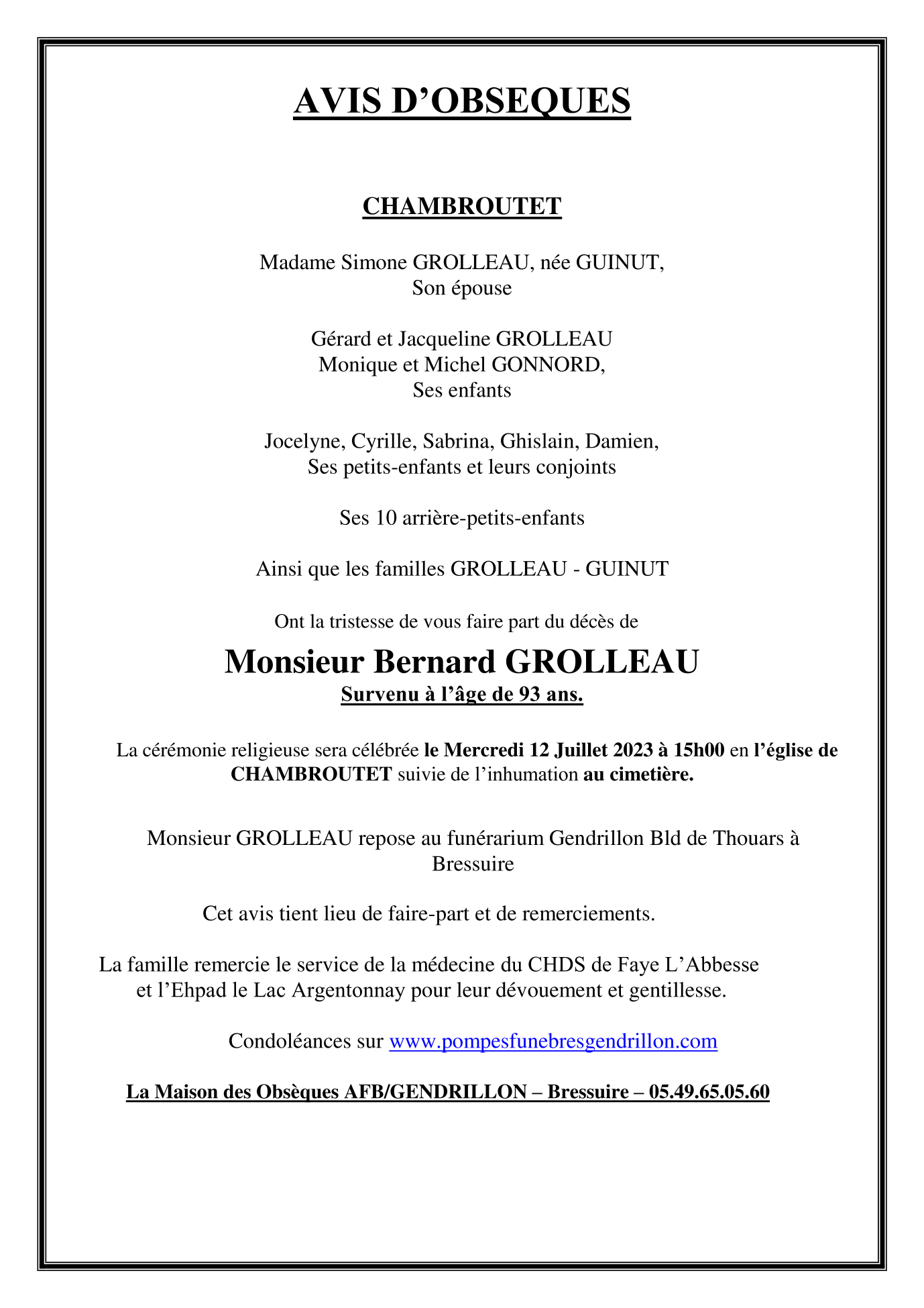 Cet espace « condoléances » est dédié à la mémoire de Monsieur Bernard GROLLEAU.