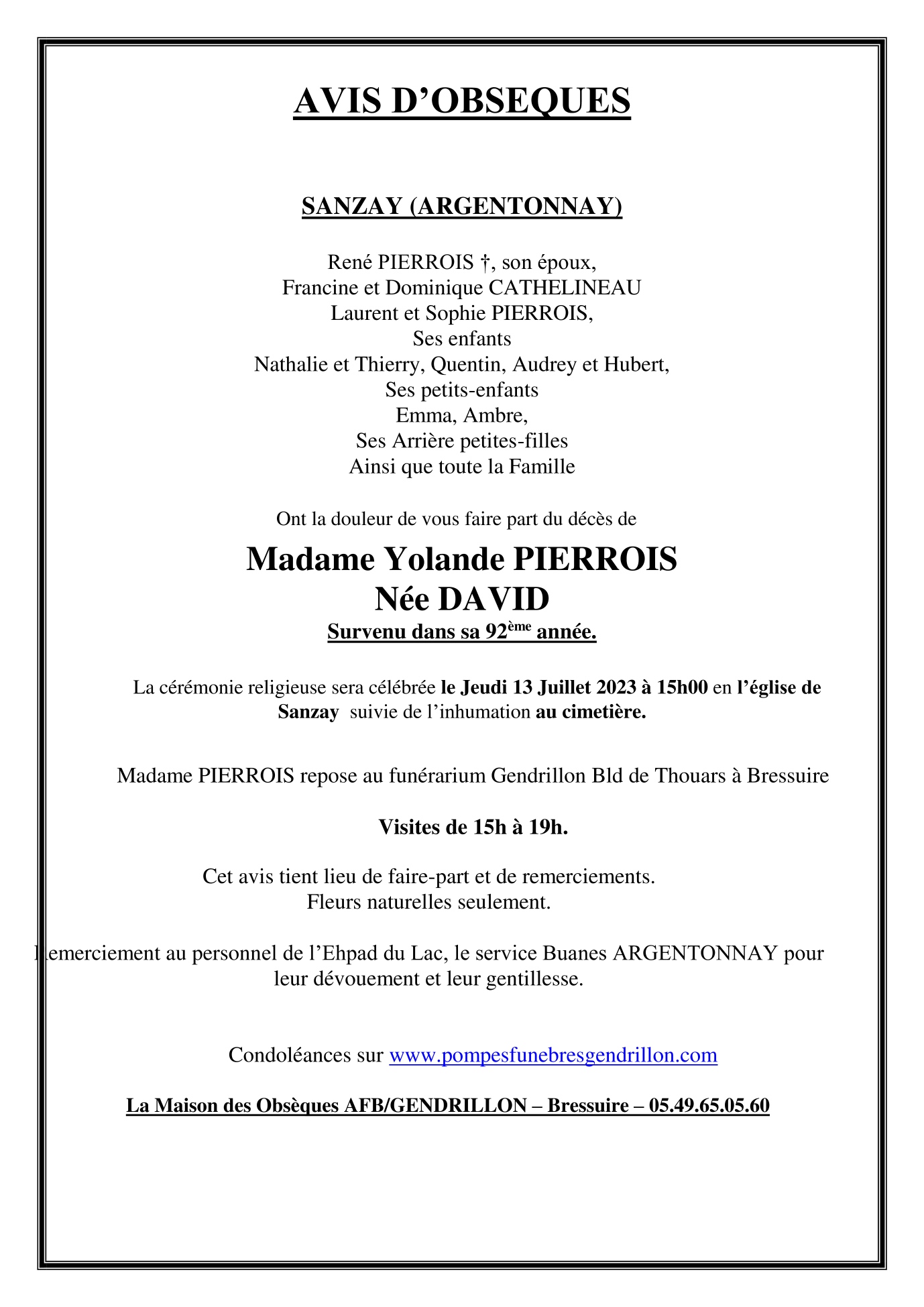 Cet espace « condoléances » est dédié à la mémoire de Madame Yolande PIERROIS née DAVID.