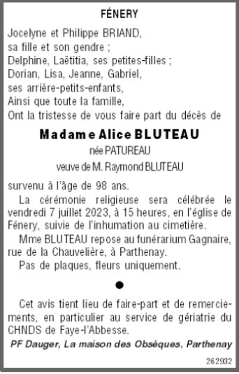 Cet espace « condoléances » est dédié à la mémoire de Madame Alice BLUTEAU née PATUREAU.