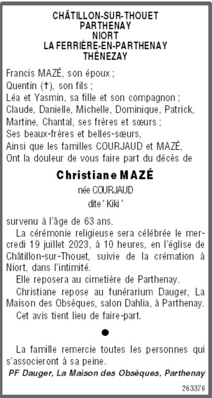 Cet espace « condoléances » est dédié à la mémoire de Madame Christiane MAZÉ née COURJAUD.