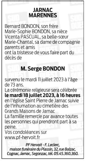 Cet espace « condoléances » est dédié à la mémoire de Monsieur Serge BONDON.