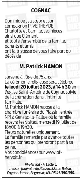 Cet espace « condoléances » est dédié à la mémoire de Monsieur Patrick HAMON.