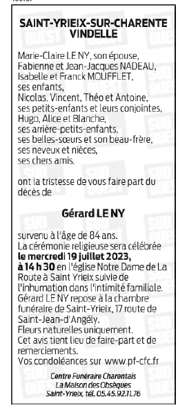 Cet espace « condoléances » est dédié à la mémoire de Monsieur Gérard LE NY.