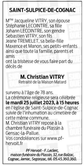 Cet espace « condoléances » est dédié à la mémoire de Monsieur Christian VITRY.