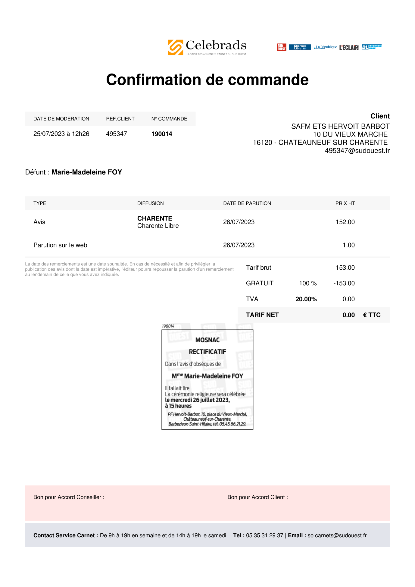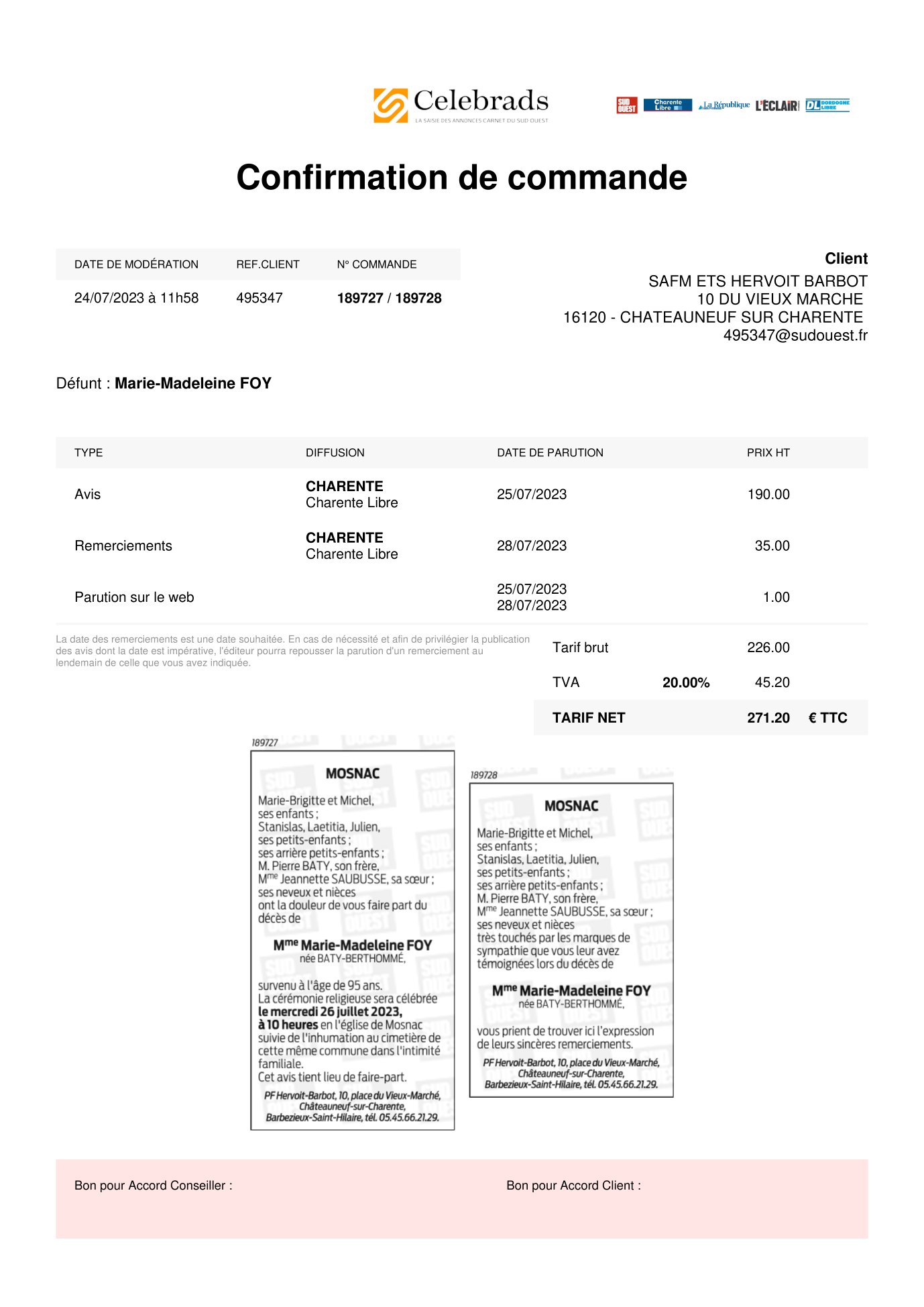 Cet espace « condoléances » est dédié à la mémoire de Madame Marie Madeleine FOY née BATY-BERTHOMMÉ.