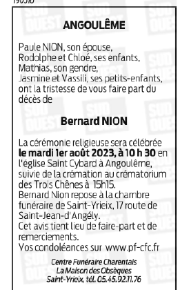 Décédé à Châteauneuf-sur-Charente (16120) le jeudi 27 juillet 2023