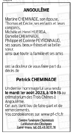 Cet espace « condoléances » est dédié à la mémoire de Monsieur Patrick CHEMINADE.