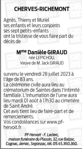 Cet espace « condoléances » est dédié à la mémoire de Madame Danièle GIRAUD née GIRAUD.