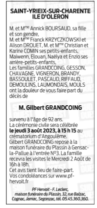 Décédé à Châteaubernard (16100) le samedi 29 juillet 2023