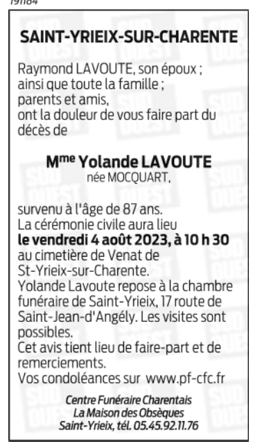 Cet espace « condoléances » est dédié à la mémoire de Madame Yolande LAVOUTE née MOCQUART.