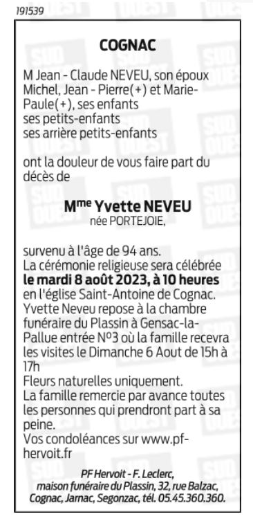 Cet espace « condoléances » est dédié à la mémoire de Madame Yvette NEVEU née PORTEJOIE.