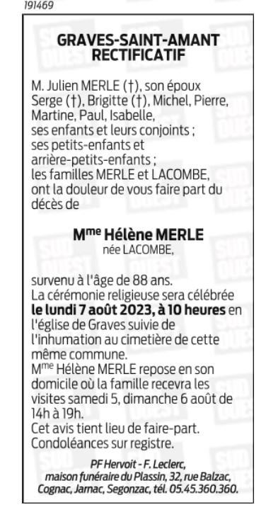 de Madame Hélène MERLE née LACOMBE