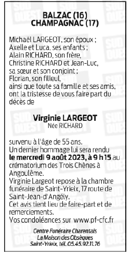 Cet espace « condoléances » est dédié à la mémoire de Madame VIRGINIE LARGEOT née RICHARD.