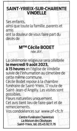 Cet espace « condoléances » est dédié à la mémoire de Madame Cécile BODET née JAY.