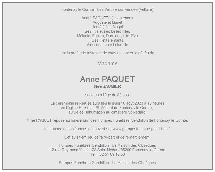 Cet espace « condoléances » est dédié à la mémoire de Madame Anne PAQUET née JAUMIER.