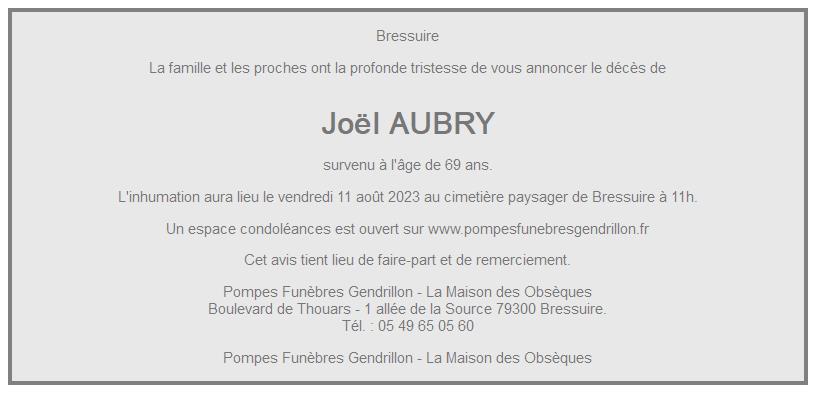 Cet espace « condoléances » est dédié à la mémoire de Monsieur Joël AUBRY.