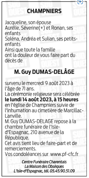 Cet espace « condoléances » est dédié à la mémoire de Monsieur Guy DUMAS-DELÂGE.