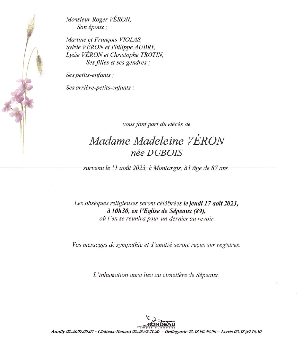 Cet espace « condoléances » est dédié à la mémoire de Madame Madeleine VERON née DUBOIS.