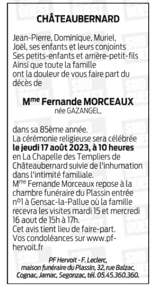 Décédée à Châteaubernard (16100) le samedi 12 août 2023