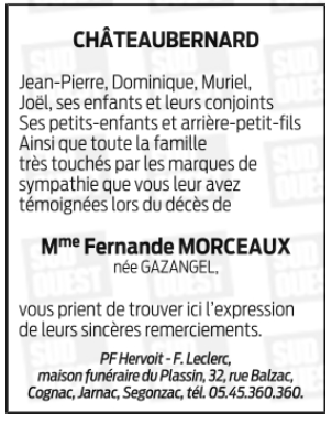 de Madame Fernande Augustine Maria Anna MORCEAUX née GAZENGEL