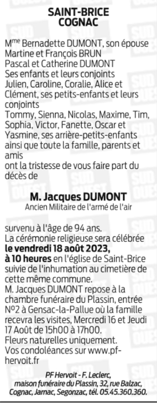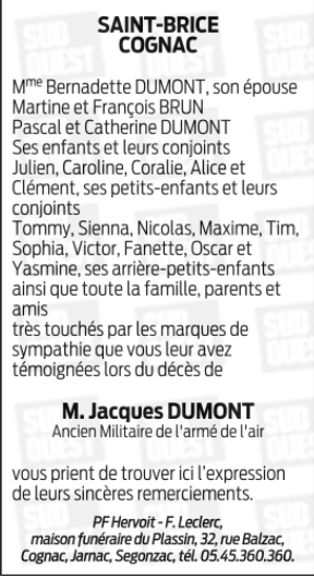 Cet espace « condoléances » est dédié à la mémoire de Monsieur Jacques DUMONT.