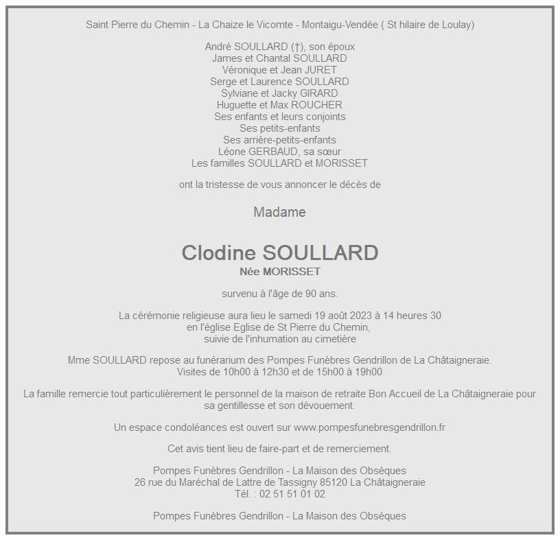 Cet espace « condoléances » est dédié à la mémoire de Madame Clodine SOULLARD née MORISSET.