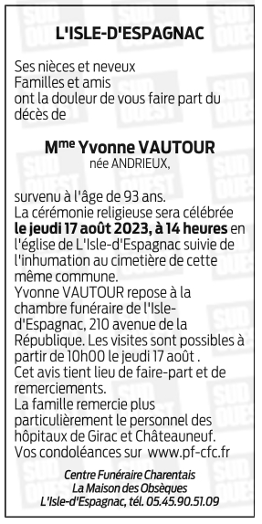 Cet espace « condoléances » est dédié à la mémoire de Madame Yvonne VAUTOUR née ANDRIEUX.