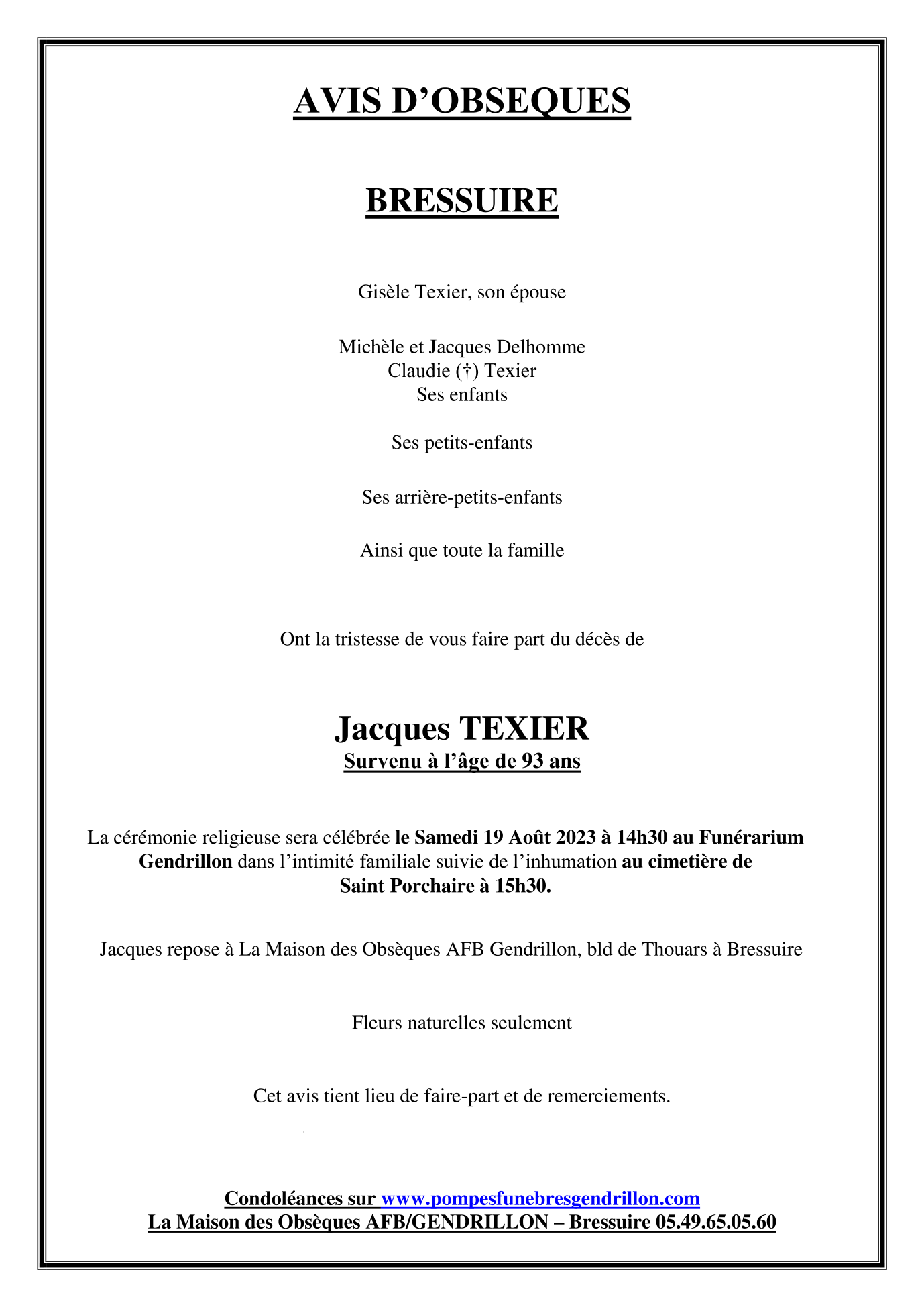 Cet espace « condoléances » est dédié à la mémoire de Monsieur Jacques TEXIER.