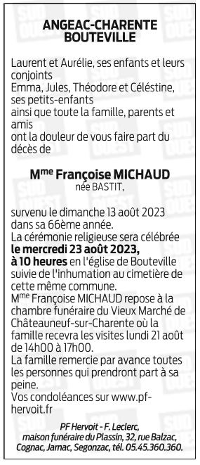 de Madame Françoise MICHAUD née BASTIT
