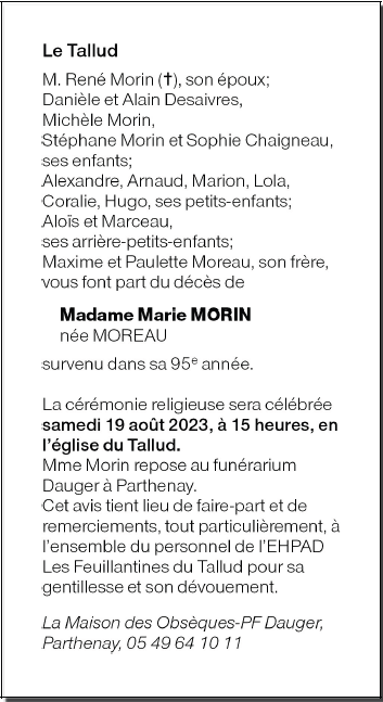 Cet espace « condoléances » est dédié à la mémoire de Madame Marie MORIN née MOREAU.