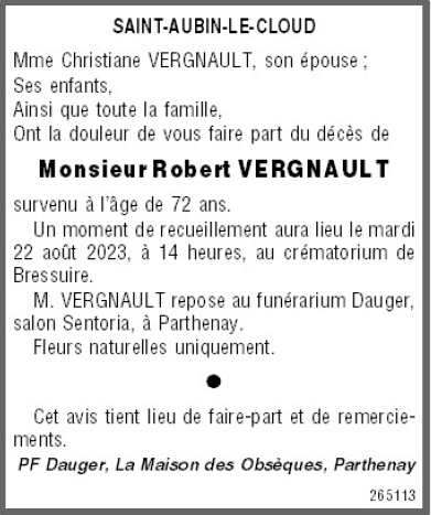Cet espace « condoléances » est dédié à la mémoire de Monsieur Robert VERGNAULT.