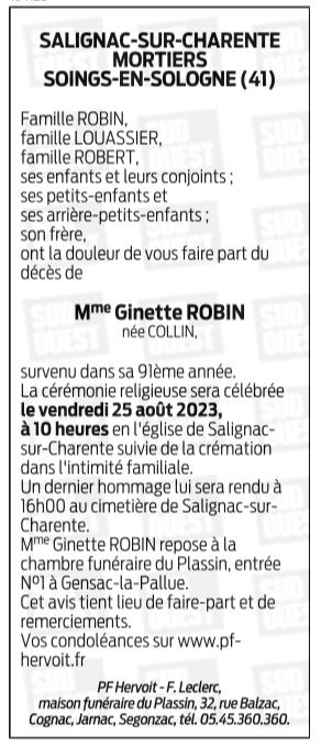 Cet espace « condoléances » est dédié à la mémoire de Madame Ginette ROBIN née COLLIN.