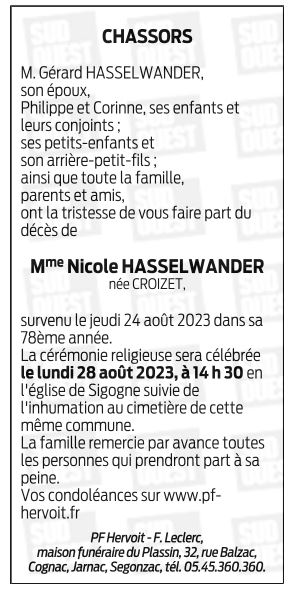 Cet espace « condoléances » est dédié à la mémoire de Madame Nicole HASSELWANDER née CROIZET.