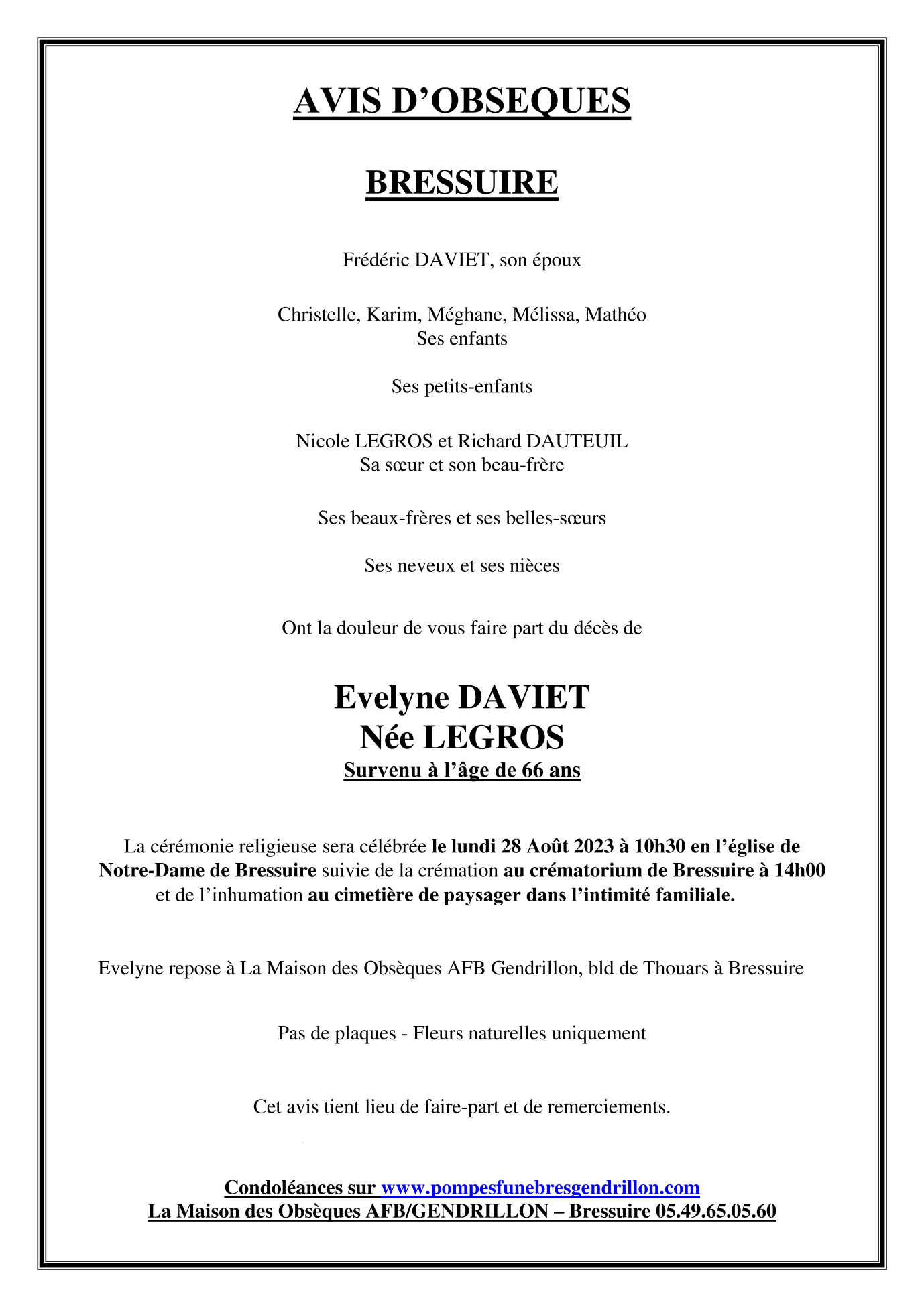 de Madame Evelyne DAVIET née LEGROS