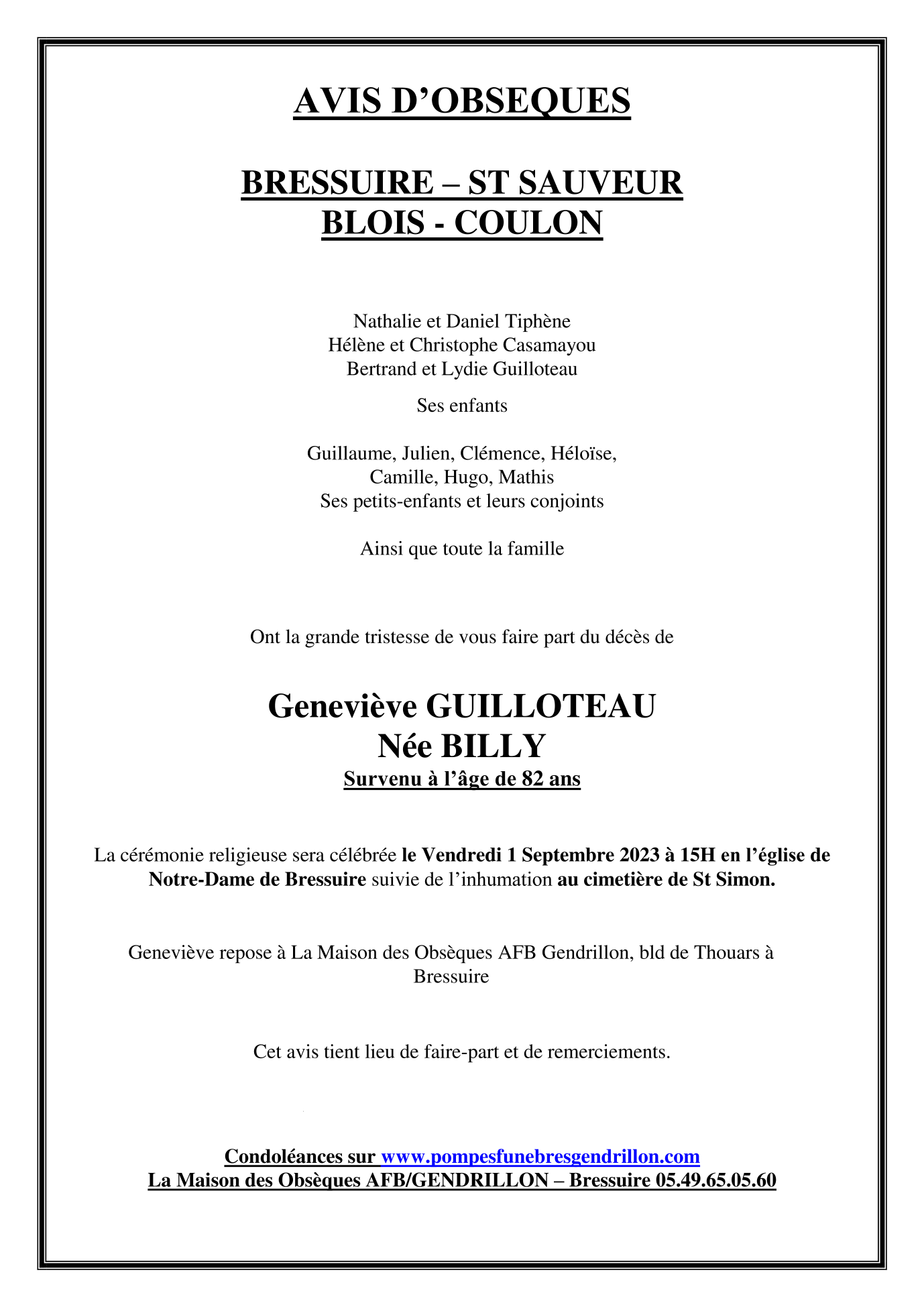 Cet espace « condoléances » est dédié à la mémoire de Madame Geneviève GUILLOTEAU née BILLY.